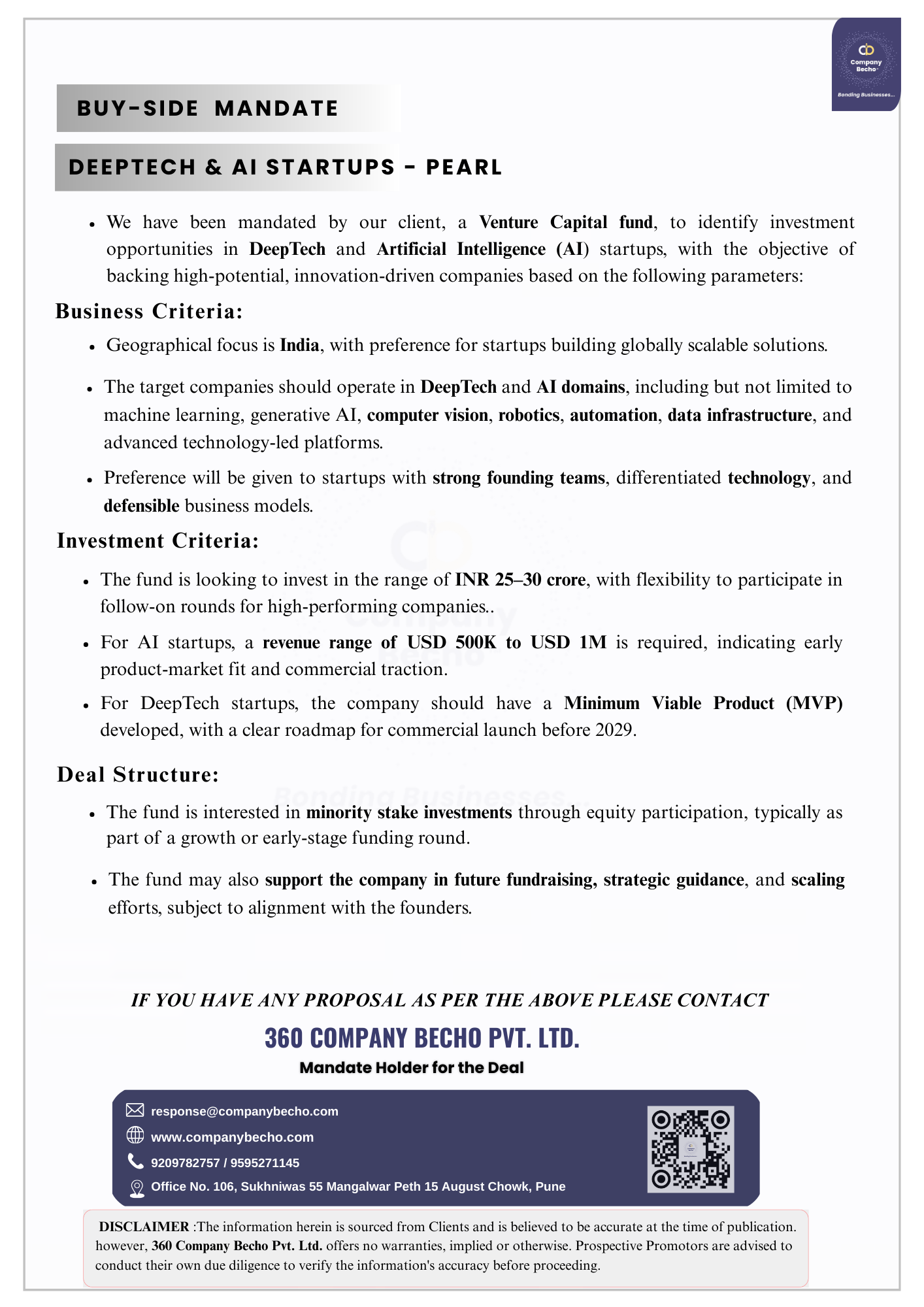 | DEEP TECH & AI | Deep Tech & AI Domain, Machine Lerning | PEARL |  | INR 25-30 Crores |